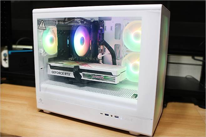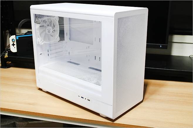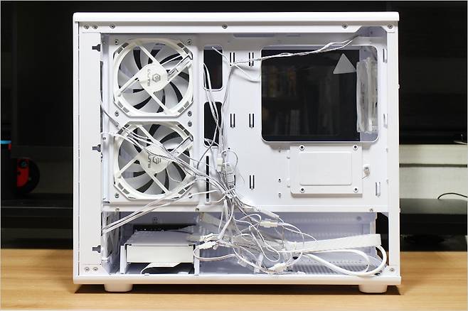 모든 설치를 끝낸 모습입니다. 심플하면서도 깔끔한 미니케이스가 완성되었습니다. 기본 쿨러 내장 6개에 설치하기 쉬운 구조와 유선형 디자인 등 디자인이 상당히 마음에 듭니다.