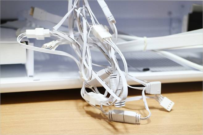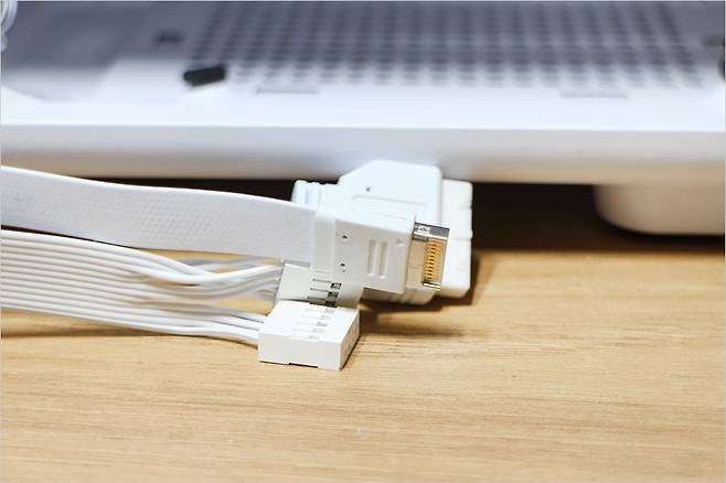 쿨러들의 전원 케이블은 하나하나 연결되어 있어서 굳이 뺄 필요가 없으며 CHA_FAN 핀에 연결하면 구동이 됩니다. ARGB 구동을 위해서는 메인보드의 5V ADD HEADER 에 장착하거나 보드가 지원하지 않는다면 추가 컨트롤러를 통해 장착이 가능합니다. 그리고 Type-C 타입 케이블도 확인할 수 있습니다.