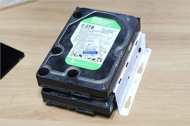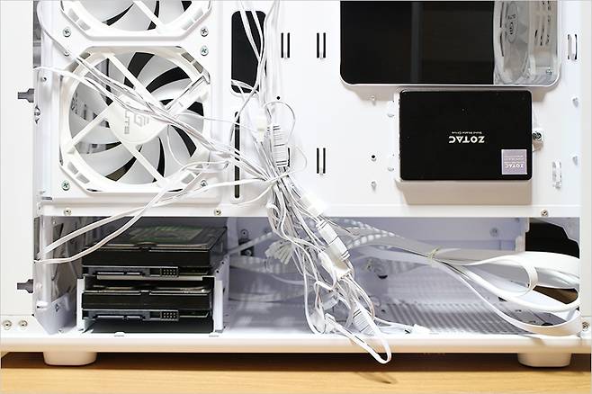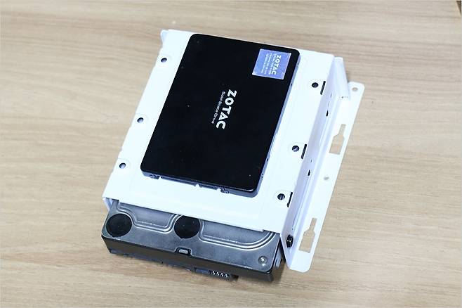 HDD 및 SSD는 HDD베이를 통해 2단으로 쌓아 설치가 가능하며 측면에 위치한 SSD 가이드를 통해 추가 SSD 설치가 가능합니다. 미니케이스 답게 저장매체는 이정도만 설치가 가능합니다.