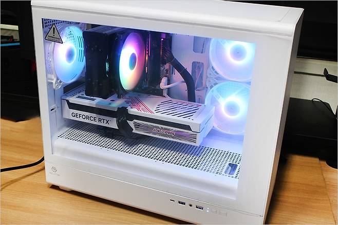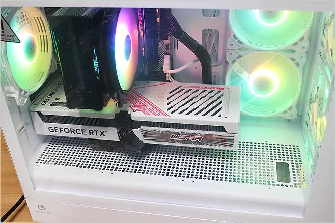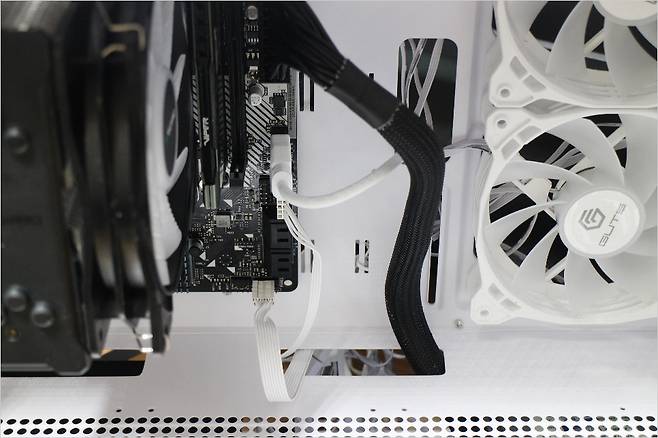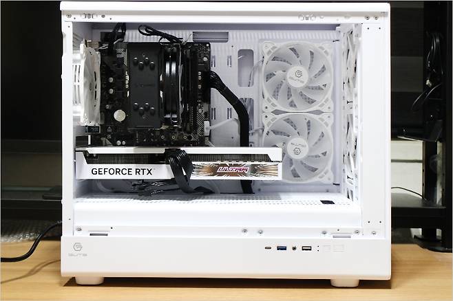 설치가 완료된 내부 모습인데요. 전체적으로 깔끔한 느낌이 들며 내부 공간이 넓기 떄문에 400mm 3열 그래픽카드도 문제 없이 설치 및 사용이 가능합니다. 그리고 그래픽카드와 앞면과의 넓은 공간을 통해 나은 쿨링 효과를 기대할 수 있습니다.