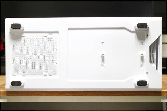 상단 먼지 필터는 자석 형식이며 3개의 추가 팬이나 3열 수랭 쿨러 설치가 가능합니다. 하단부에도 먼지 필터를 확인할 수 있습니다. 그리고 하단 거치 패드는 두꺼운 편이어서 거치시 딱딱하지 않고 확실히 안정적인 느낌이 듭니다.