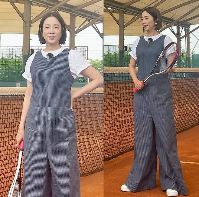 박은영은 사진과 영상에서 흰 반팔 티셔츠에 통이 넓은 와이드핏 스트라이프 점프슈트를 입고 테니스를 즐기는 모습을 공개해 시선을 사로잡았다.