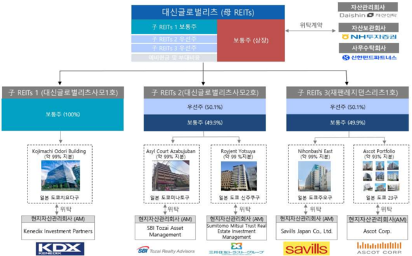 대신글로벌리츠도 대신밸류리츠와 마찬가지로 일본 내 자산을 담은 자리츠들의 지분증권을 대신글로벌리츠가 매입하는 구조를 만든다. 대신글로벌리츠사모제1호(자리츠1)는 일본 도쿄 중심 3구 중 하나인 지요다구 한조몬 지역에 위치한 오피스빌딩 고지마치오도리빌딩을 포함했다.