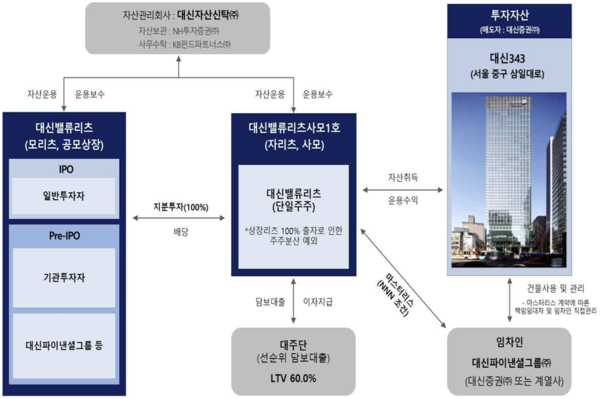 금융투자 업계에 따르면 대신밸류리츠는 3260억원에 자리츠인 대신밸류리츠사모제1호 지분 100%를 인수한다. 해당 자리츠는 대신그룹 계열사들이 입주한 서울 중구 삼일대로 343의 본사 사옥(대신343)을 기초자산으로 편입했다. 매입가격은 6620억원이었다.