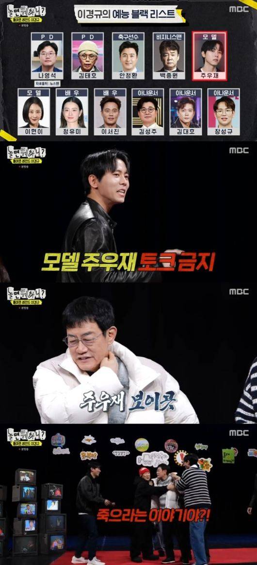 MBC ‘놀면 뭐하니?’에서 이경규가 “넌 내가 나오지 말라고 했잖아”라며 호통치자, 주우재는 얌전히 웃으며 깨갱하는 모습으로 큰 웃음을 안겼습니다.