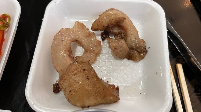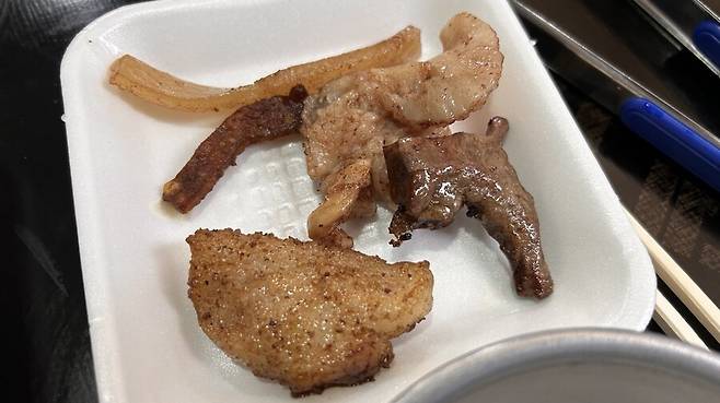 위에서 지적했듯, 뜨거운 고기를 스티로폼 앞접시에 올려 놓으니 접시가 녹습니다.