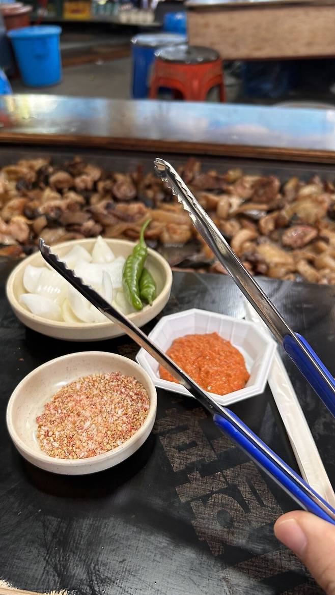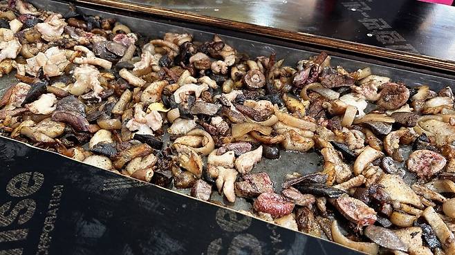 그... 좀 불길해 보이는 돼지부속들이 누린내를 풍기며 구워지고 있습니다.