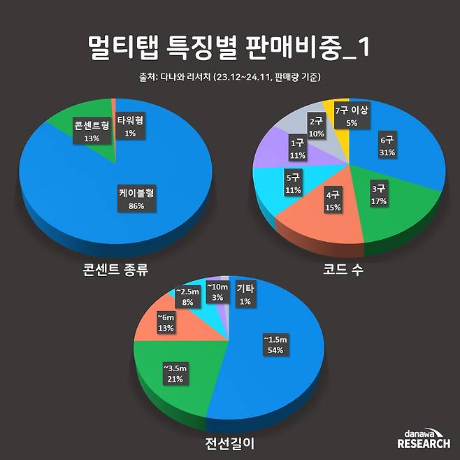 2023년 12월부터 2024년 11월까지 멀티탭 판매 비중을 분석한 결과, 실용성과 편리성을 중시하는 소비자 트렌드가 뚜렷하게 나타났다. 콘센트 종류는 케이블형 멀티탭이 86%의 압도적인 비중을 차지했다. 케이블형 멀티탭은 가정과 사무실에서 이동성과 확장성을 위해 주로 사용되는 종류다.