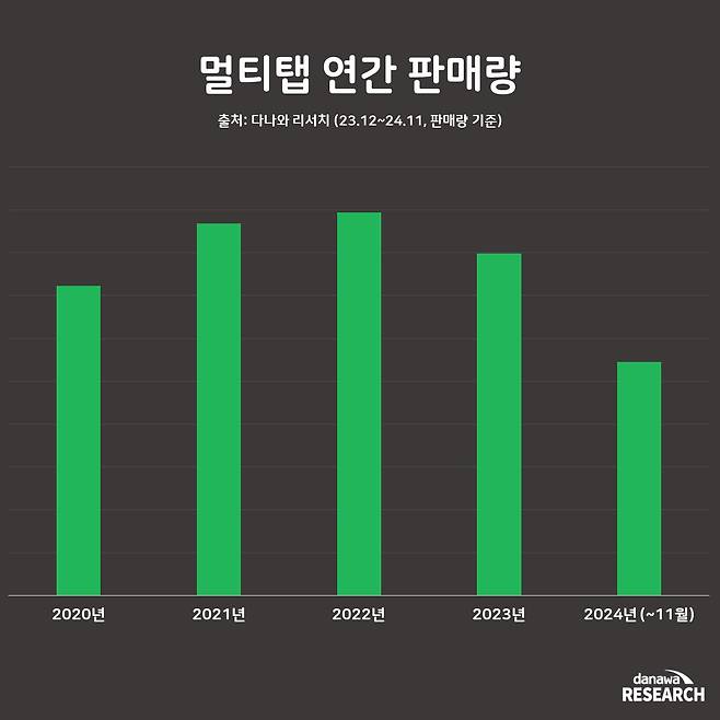 다나와 구매 통계 데이터를 활용한 다나와 리서치에 따르면, 멀티탭 판매량은 2022년까지 꾸준히 증가하며 전성기를 맞았다. 이는 팬데믹으로 인한 재택근무와 온라인 학습의 확산으로 전자기기 사용이 폭증하며 멀티탭의 수요가 급증한 결과로 분석된다. 그러나 2022년 이후 팬데믹 종료와 함께 IT 기기의 실내 사용 수요가 감소하면서 멀티탭 판매량도 점차 하락세로 접어든 것으로 보인다. 이와 함께, 멀티탭을 단순 소모품으로 여기는 소비자 인식도 판매 감소의 원인 중 하나로 보인다. 하지만 멀티탭은 안전성과 품질이 중요시되는 제품이며 안전한 전기 사용을 위해 정기적인 점검이 필요한 제품임을 명심해야 된다.