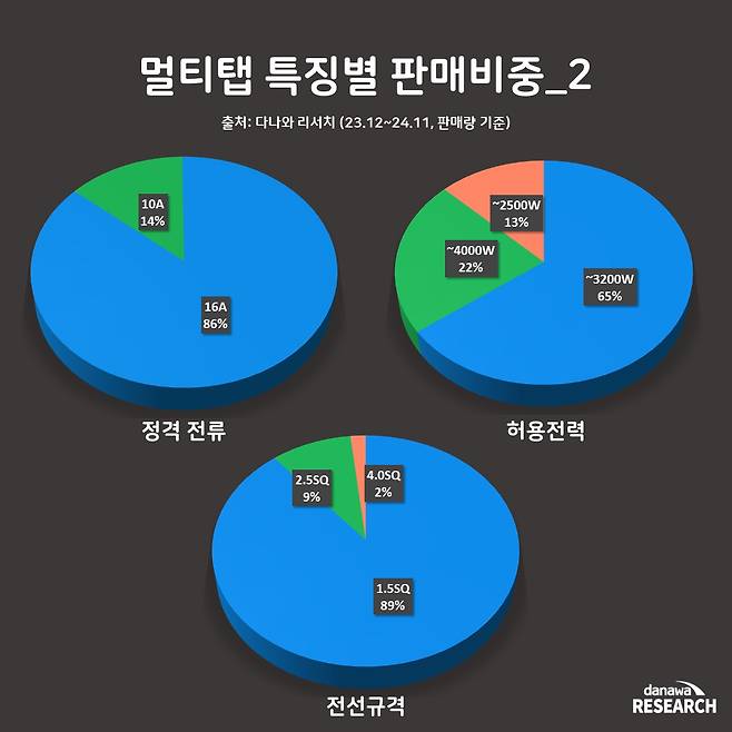 멀티탭의 주요 스펙 중 하나인 정격 전류는 허용 가능한 최대 전류를 의미하며, 이를 초과하면 과부하로 인해 전류가 차단되거나 멀티탭이 손상될 수 있다. 최근 다나와 판매 데이터를 보면 시장의 대다수 제품(86%)이 16A 정격 전류를 갖춘 제품으로, 안정적인 전류 사용을 위해 주로 선택되고 있다.