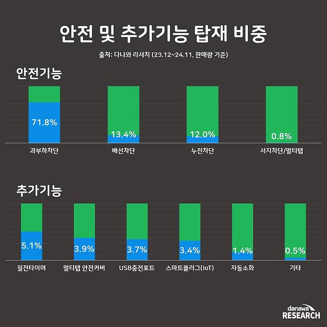 그 외 추가 기능으로 절전 타이머가 (5.1%), 멀티탭 안전커버(3.9%), USB 충전포트(3.7%), 스마트 플러그(IoT) (3.4%) 등을 탑재한 멀티탭이 판매됐다. 절전 타이머와 스마트 플러그는 에너지 효율성과 IoT 기술을 선호하는 소비자 트렌드를 보여주며, 자동 소화 기능은 화재 위험으로부터 물리적 예방을 위한 기능으로 스티커 형태로도 판매되고 있다.