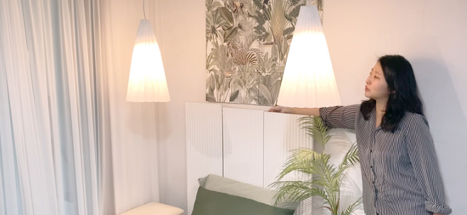 여러분도 하나의 공간이라고 하더라도 3개 이상의 조명을 사용해 주시면 호텔 같은 아늑함을 만들어내실 수 있습니다. 위의 사진을 보시더라도 침대를 중심으로 펜던트 조명을 설치했죠. 또 침대 헤드 뒤에는 간접조명 용도로 바 조명을 설치해서 아늑한 느낌을 떠올리도록 했어요.