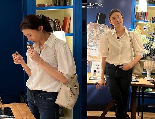 또, 차예련은 다크 블루 스키니 진을 매치하여 전체적으로 슬림한 실루엣을 완성했습니다.