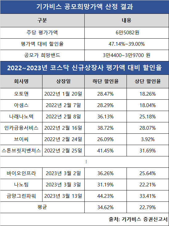 코스닥 상장에 도전하는 반도체 회로검사 장비 제조기업 기가비스가 공모가 희망밴드 산정에 높은 할인율을 적용해 오버밸류 논란을 피했다. 공모 후 지분율이 60%를 넘어서는 최대주주 보유 지분에 대해서도 2년 6개월의 락업(보호예수)을 걸어 두며 시장 친화적 제스처를 취했다.