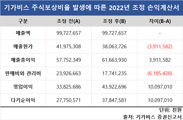 기가비스는 해당 주식보상비용 101억원을 이번 IPO 과정에서 조정 손익계산서에 반영했다. 매출액은 997억원으로 그대로지만, 영업이익은 338억원에서 439억원, 당기순이익은 278억원에서 378억원으로 각각 상향 조정됐다. 기가비스가 주식보상비용을 당기순이익에 가산하지 않았다면 주당 평가가액은 4만7727원이 된다.
