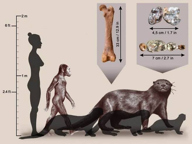 이어 “수달 중에도 제법 몸집이 큰 종은 현재도 생존한다”며 “남미에 사는 수달들은 체중이 30㎏이고 북미에 서식하는 수달의 친척뻘인 해달은 45㎏이 나가기도 하지만 200㎏ 넘게 나가는 건 고대종뿐”이라고 설명했다.