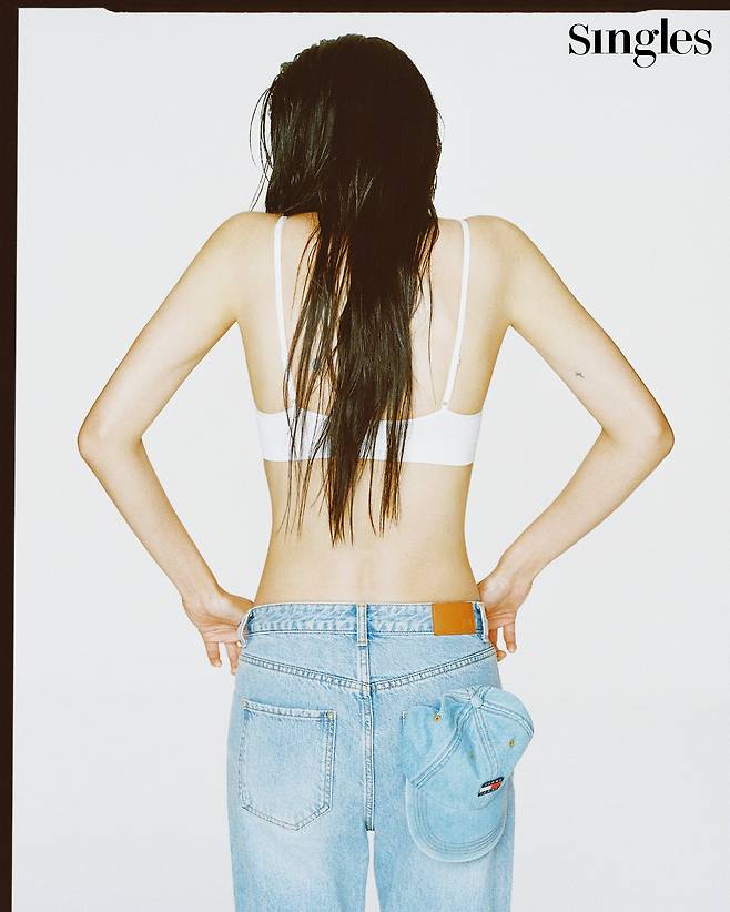 브라 톱은 1만4900원 H&M, 데님 팬츠는 17만5000원 COS, 데님 캡 모자는 6만2000원 Tommy Jeans.