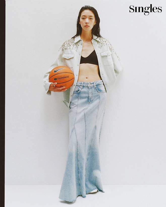 셔츠는 177만원 Golden Goose, 브라 톱은 1만4900원 H&M, 데님 스커트는 34만5000원 All Saints, 스니커즈는 9만5000원 Converse.