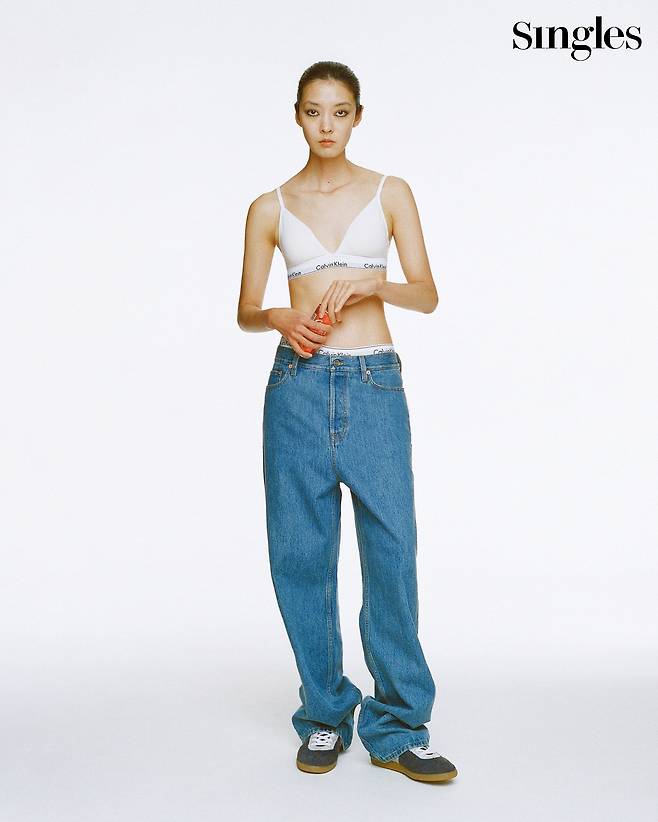 로고 밴드 브라 톱은 7만9000원, 브리프는 3만원 모두 Calvin Klein Underwear, 데님 팬츠는 가격 미정 Gucci, 블루 스니커즈는 가격 미정 Masion Margiela.