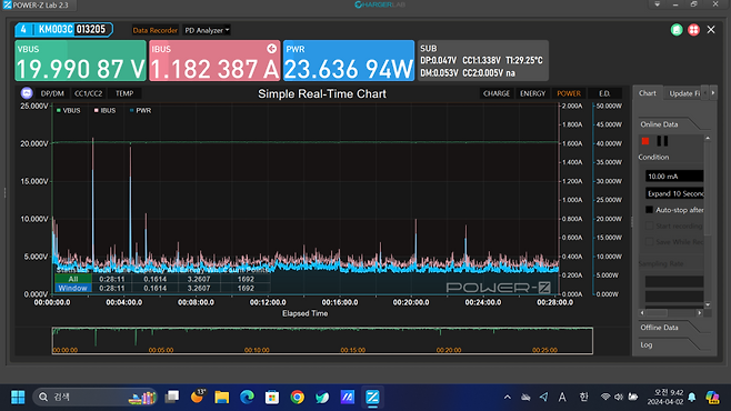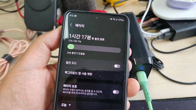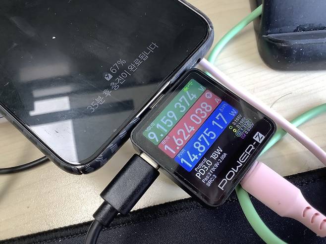2. 삼성 PPS를 지원 안 합니다. 사양에는 지원하는데 실제로는 PPS를 지원하지 않습니다. 이는 고속 충전을 위해 통신을 하는 이른바 프로토콜 지원이 부족한 것에 그 이유가 있는 듯 합니다. 앞서 출력을 고정한 것도 가격을 낮추기 위한 방법 가운데 하나인데, 이런 통신 프로토콜이 부족한 것도 사실 알고보면 값 때문입니다. 그래서 삼성 초고속 충전, 그러니까 파란색 불은 안 보입니다. 그 점은 아쉽네요. 물론 초고속충전과 고속 충전의 실제 속도 차이는 그렇게 크지는 않습니다.