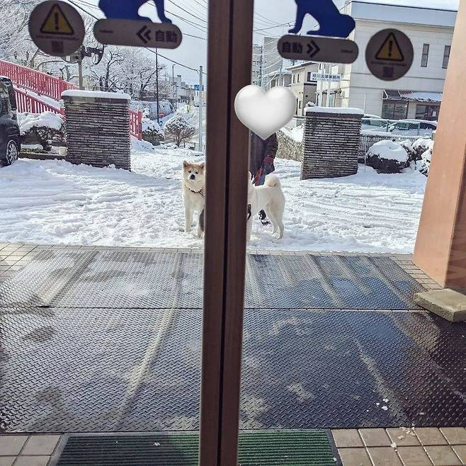 마치 흑인 보스가 주인을 데리러 아키타 경호원 3명을 데리고 오는 것처럼 보이기도 합니다! 주인을 기다리는 네 마리의 강아지가 무척 귀엽습니다!
