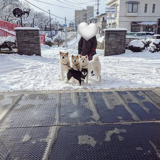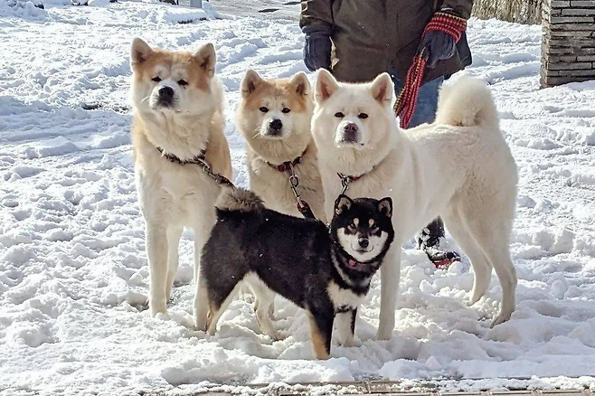 검은 시바견이 앞에 서고 세 마리의 아키타가 뒤에 정렬한 모습은 마치 보스와 보디가드의 모습을 연상케 했습니다.