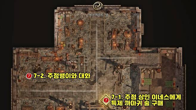 7-1. 아스가르드 성 - 레이븐스 홀 NPC 주점 상인 이네스에게 특제 까마귀 술 구매7-2. 특제 까마귀 술을 보유한 상태로 NPC 주정뱅이와 대화