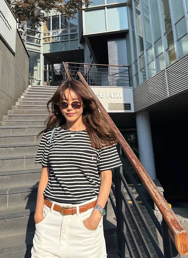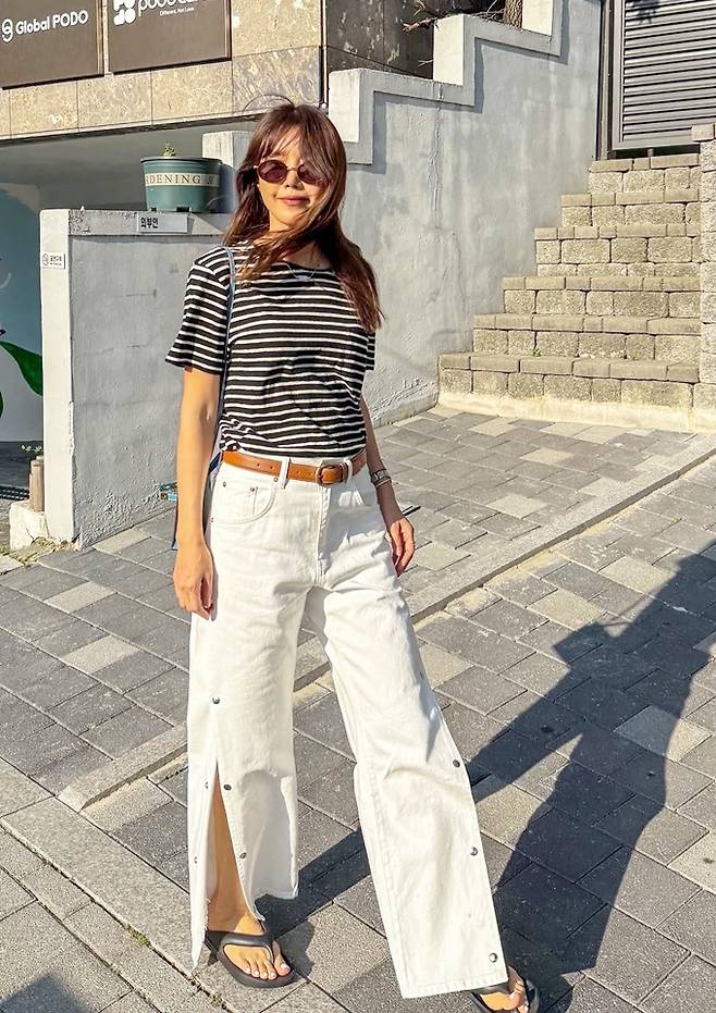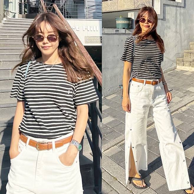 배우 채정안이 스트라이프 티셔츠와 슬릿 팬츠로 군더더기 없는 쿨시크 리얼웨이룩을 완성했다.