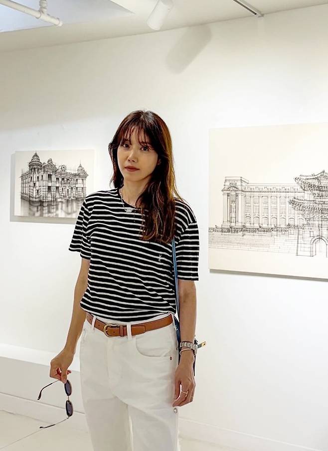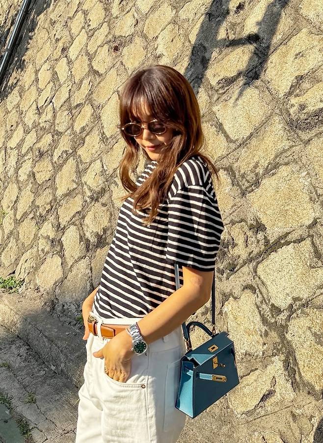 공개한 사진에서 채정안은 스트라이프 티셔츠에 옆트임이 있는 슬릿 버튼 화이트 팬츠를 착용한 외출룩으로 심플하면서도 시원한 여름 스타일을 선보였다.