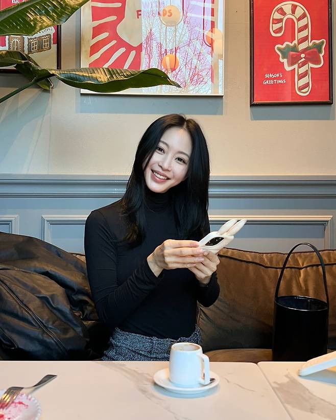 한예슬은 블랙 터틀넥과 트위드 소재의 미니스커트를 매치해 시크하면서도 우아한 분위기를 연출하고 있다. 특히 체크 패턴이 돋보이는 스커트는 클래식한 매력을 더하며, 전체적으로 세련된 카페 데이트룩을 완성했다. 자연스럽게 흘러내린 긴 생머리가 그녀의 우아한 분위기를 한층 강조하고 있다.
