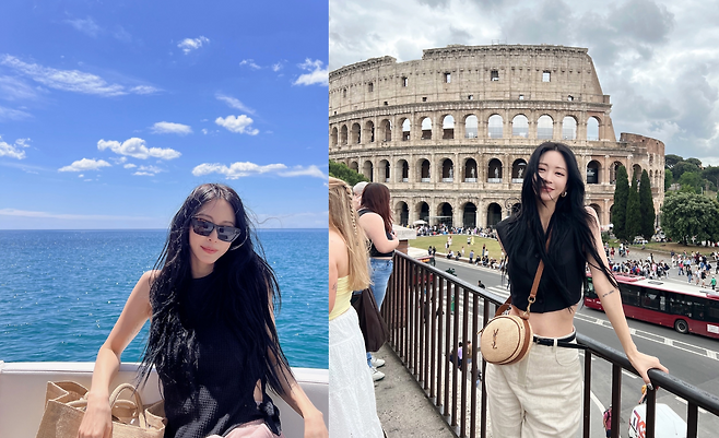 블랙 크롭 재킷과 베이지 와이드 팬츠를 매치해 편안하면서도 스타일리시한 여행룩을 연출하고 있다. 콜로세움을 배경으로 한 사진에서 그녀는 YSL 라운드 백을 포인트 아이템으로 활용해 고급스러운 분위기를 완성했다. 자연스러운 포즈와 함께 여행지에서도 놓치지 않는 패션 감각을 보여주고 있다.