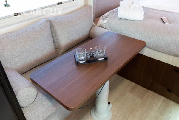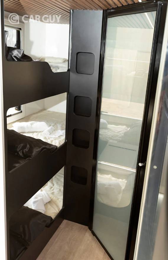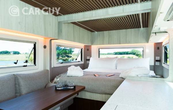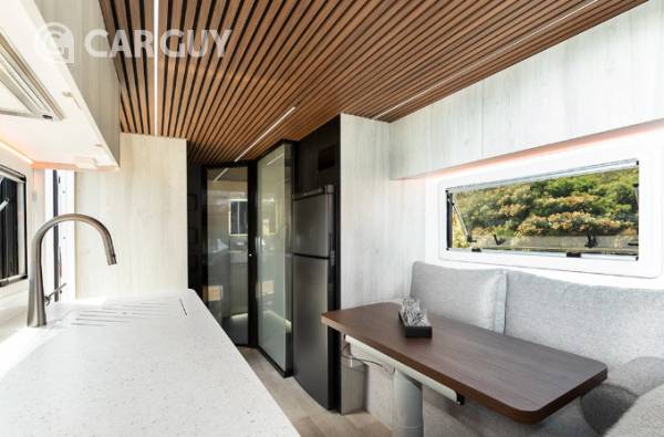 야외 요리 준비는 정말 간편하다. 피크닉 테이블을 열면 안에서도 사용할 수 있는 빌트인 팬트리가 나타난다. 욕실 옆쪽에 어린이용 침대가 있다. 천장의 목재 패널은 보기에 아름다울 뿐만 아니라, 방음 역할도 한다.