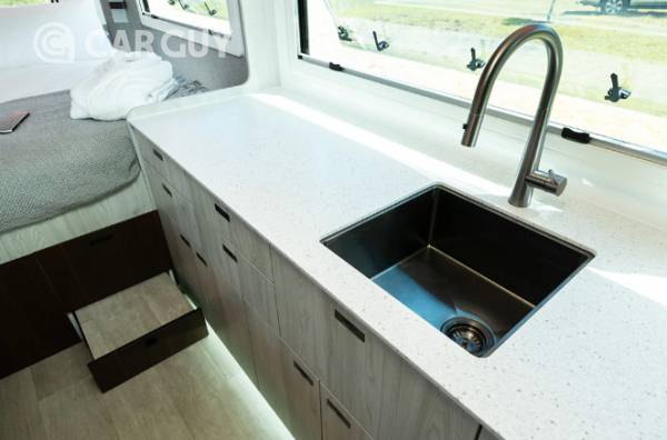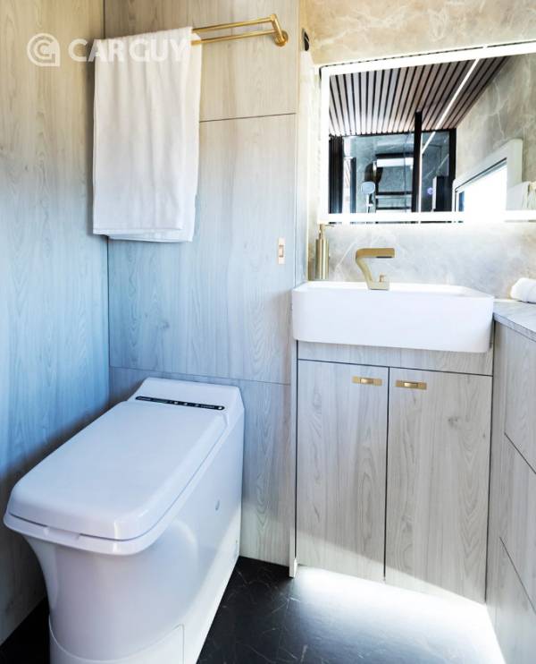 차체가 비교적 높은 위치라 기존 캐러밴용 발판으로는 짧아 접이식 발판을 밴 출입구에 맞게 설계했다. 접이식 난간도 있어 쉽고 안전하게 사용할 수 있다. 내부 캐비닛은 경량 복합 소재다.