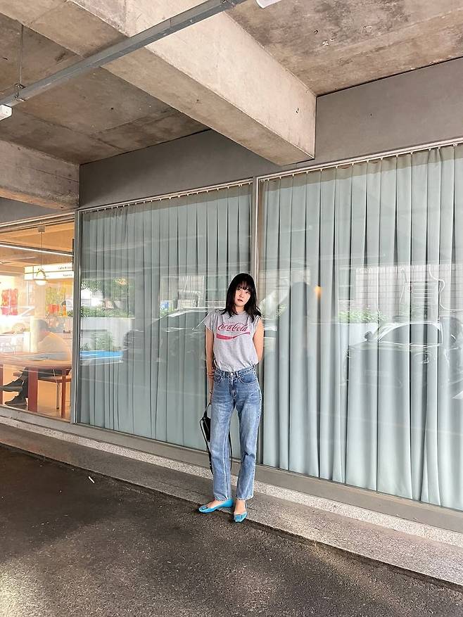 룩의 반전 포인트는 슈즈에서 드러난다. 그녀는 전체적으로 절제된 톤의 착장에 블루 컬러의 플랫슈즈를 매치해 경쾌한 리듬감을 더했다. 단순한 스타일 속에서도 확실한 존재감을 주는 이 슈즈는 캐주얼하면서도 위트 있는 무드를 연출하는 키 아이템이다.