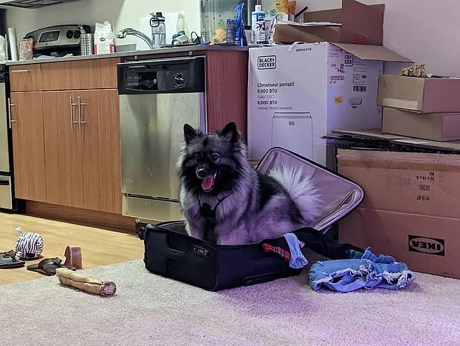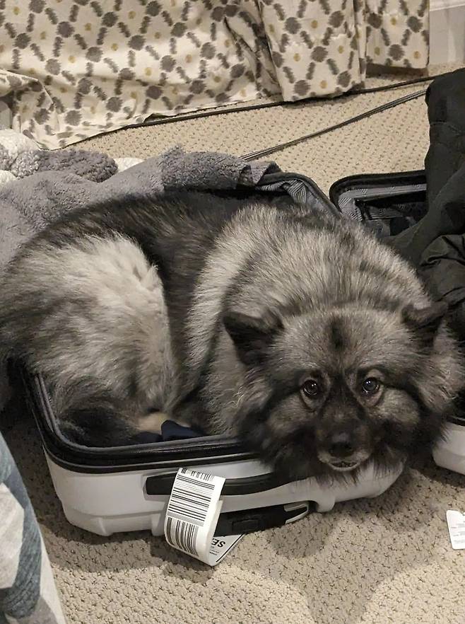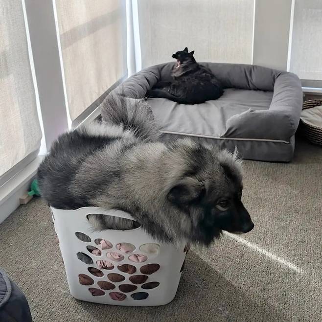 하지만 15kg 케이스혼드견 '베이글스'는 다르다. 빨래 바구니든 여행가방이든 작고 좁은 공간만 보면 꾸깃꾸깃 몸을 구겨 넣는다.