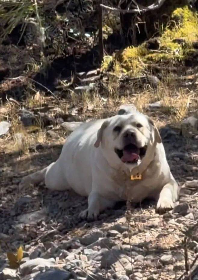 살이 너무 쪄서 걱정된 주인은 다이어트 겸 산책을 시키려 산에 데리고 갔는데, 강아지가 중간에 힘들어 주저앉아 버렸습니다.