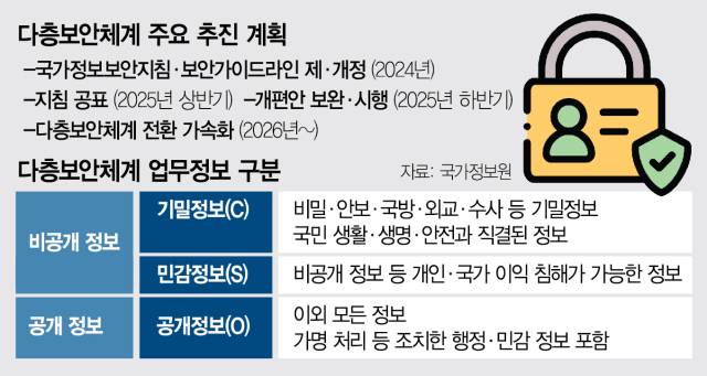 12일 국정원에 따르면 내년부터 본격적으로 정부 부처·공공기관 등 국가 망에 다층보안체계가 적용된다. 데이터 중요도에 따라 등급을 차등화해 보안 방식을 유연하게 적용한다는 취지다. 신용석 국가안보실 사이버안보비서관은 이에 대해 “인터넷과 AI, 클라우드를 활용해 업무 생산성을 획기적으로 개선하자는 게 망 보안 정책의 중요한 목적”이라고 설명했다.