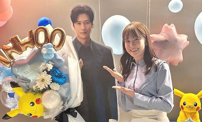 사진 속 하야시 아나운서는 나인우의 등신대 옆에서 포즈를 취하고 있으며 환한 미소를 짓고 있다.