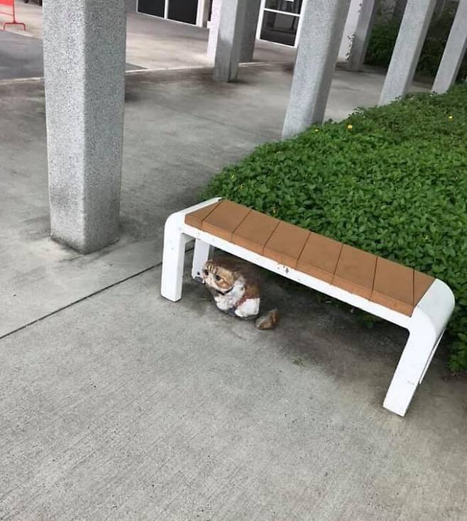 벤치 아래 웅크린 채 앉아있는 녀석의 모습은 누가 봐도 영락없는 길고양이였습니다.