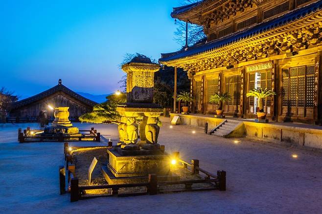 웅장한 외관은 겨울의 맑은 공기 속에서 더욱 또렷하게 드러난다. 각황전 앞에 놓인 석등 역시 국보로 높이와 너비 모두에서 압도적인 존재감을 보여준다.