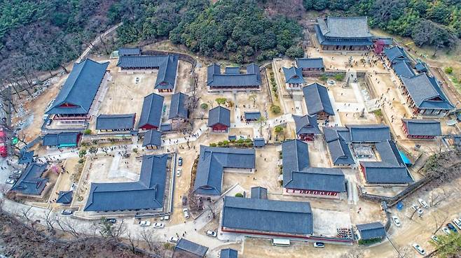이후 신라 시대에 자장율사와 도선국사가 차례로 중창하며 사찰의 틀이 점차 확장됐다. 임진왜란으로 대부분의 건물이 소실되는 아픔을 겪었으나 조선 인조 때 벽암선사가 다시 세우며 오늘날의 모습을 갖추게 됐다.