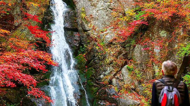 시원하게 쏟아지는 물보라와 울창한 단풍의 조화는 압도적이다. 소백산 연화봉에서 발원한 차가운 물이 자연이 빚은 무대를 만들어낸다.