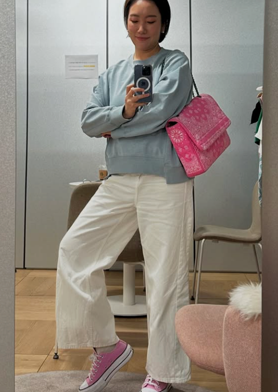 전체적인 스타일은 여유로운 핏의 라이트 블루 맨투맨과 화이트 와이드 팬츠로 편안하면서도 깔끔한 느낌을 자아낸다.
