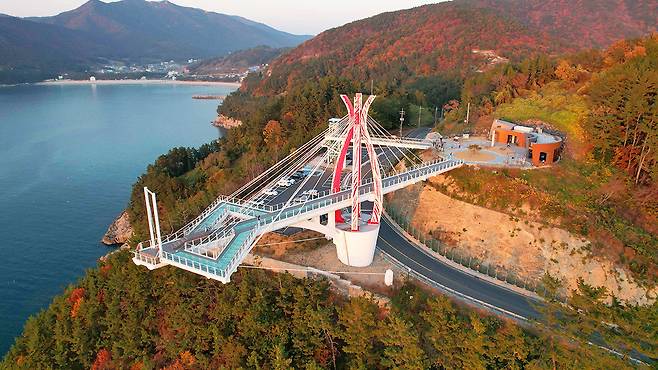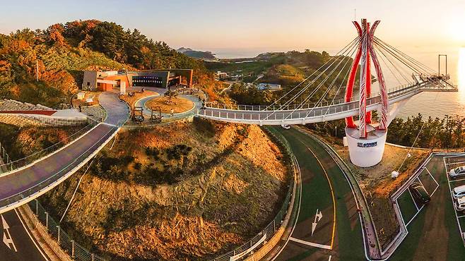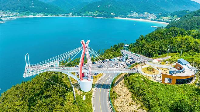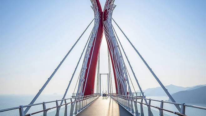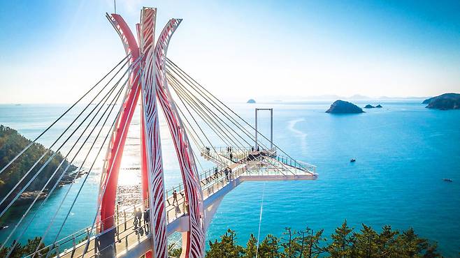경남 남해군 미조면, 바다 위로 우아하게 뻗은 곡선 구조물 하나가 여행자를 맞이합니다.