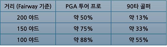 위 결과를 보면, 프로는 150야드에서 100야드로 50야드 전진할 때 GIR이 13% p 상승하지만, 90타 아마추어는 22% p나 상승한다는 것을 볼 수 있습니다. 워낙 투어 선수들의 그린 적중률이 높기 때문에 상대적인 개선치가 적다고 느껴질 수 있지만, 아마추어 골퍼의 입장에서 보면 최대한 그린에 가깝게 볼을 보내는 것이 그린 적중률을 더욱 확실하게 높이고 타수를 줄일 수 있는 확률이 높아지는 것입니다.