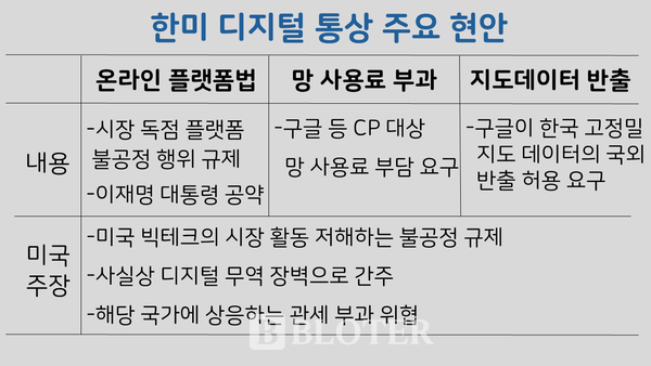 한미 정상회담에서 디지털 통상 문제가 공식 의제로 오르지 않았지만 도널드 트럼프 미국 대통령이 디지털 규제를 문제로 지적해 파장이 예상된다. △온라인플랫폼법 △망 사용료 부과 △구글의 고정밀 지도 데이터 반출 요구 등에 직접적인 영향을 받는 한국의 정보통신기술(ICT) 기업들은 자국 빅테크를 지원하기 위한 미국의 압박에 긴장하고 있다.