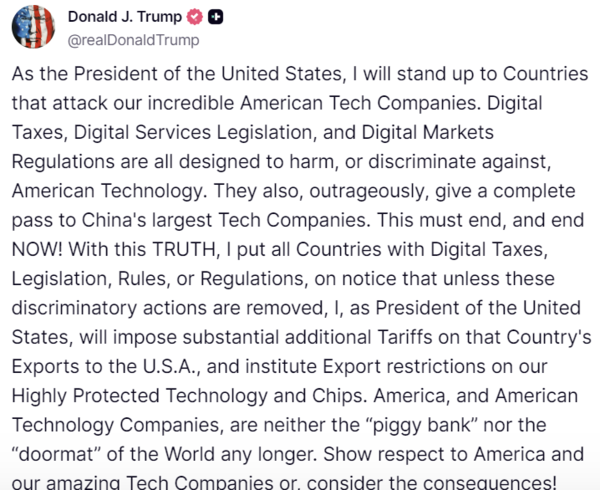 트럼프 대통령은 25일(현지시간) 소셜네트워크서비스(SNS) 트루스소셜에 "미국 기술 기업을 공격하는 국가에 맞서겠다"고 밝혔다. 그는 "디지털 세금, 디지털 서비스 법 제정, 디지털 시장 규제는 미국 기술에 피해를 주거나 차별하기 위해 설계됐다"고 주장했다. 플랫폼법과 망 사용료 부과 입법 등 한국의 디지털 규제 움직임을 염두에 둔 것으로 풀이된다.