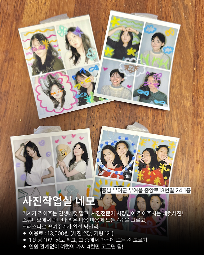 부여 사담 바로 앞에 있는 사진작업실 네모에서는 사진전공을 하신 사장님이 직접 사진을 찍어주고, 4컷을 골라 꾸미는 시간을 가지는데요.
