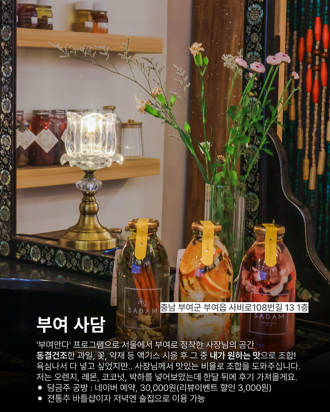 부여 창업/정착 프로그램인 '부여안다' 프로그램으로 서울에서 부여로 정착한 사장님의 공간이기도 하답니다.마지막은 부여 쌀과 한라봉의 조합으로 탄생한 대박 맛있는 #감탄주 한 잔 가득 맛보면서 마무리~!