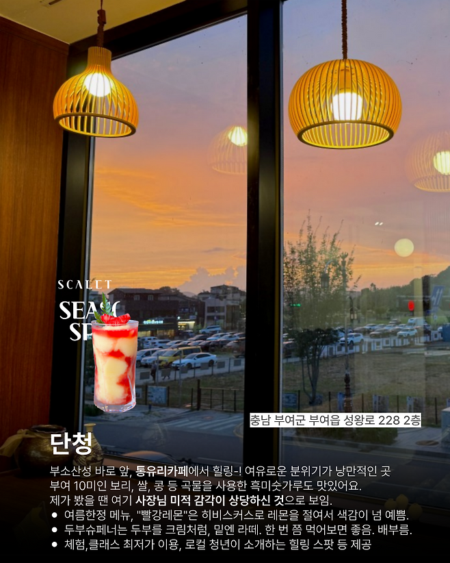 사진작업실 네모에서 도보 3분거리의 통유리카페!부소산성을 바로 앞에 두고 있어서 어떤 날씨에 가도 너무 아름답지만 해질녘에 가면 아름다운 하늘을 맞이할 수 있어요.